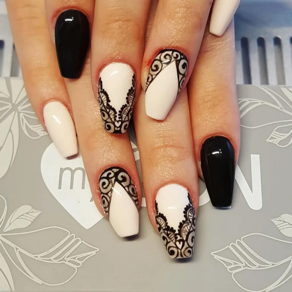 Bold and graphic, this manicure combines solid black nails with crisp white nails adorned in intricate black lace patterns. The lace features swirling scrolls and fine floral detailing, arranged to frame the nails with a couture-inspired feel. The alternating solid and lace nails create a striking contrast, making the design both elegant and dramatic.