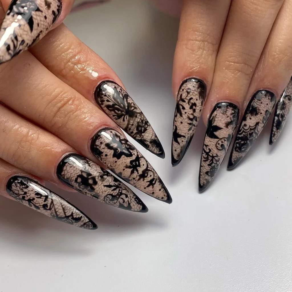 Sharp and striking, these nude stiletto nails are wrapped in intricate black lace patterns. The design features a mix of florals, mesh textures, and abstract lace shapes, blending together seamlessly. The glossy finish intensifies the contrast between the soft nude base and deep black detailing.
