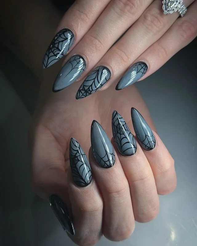 Dark and mysterious, these grey stiletto nails feature bold black spiderweb lace patterns. The glossy grey base provides a sleek backdrop that enhances the fine lines of the web design. This manicure offers a subtle gothic vibe, making it good for themed events.
