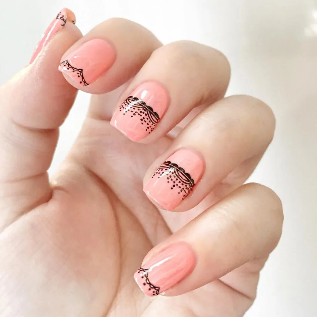 Soft peach nails get a delicate upgrade with fine black lace-inspired accents placed near the tips and cuticles. The lace features tiny dotted lines and curved patterns that add elegance without overpowering the simplicity of the design.