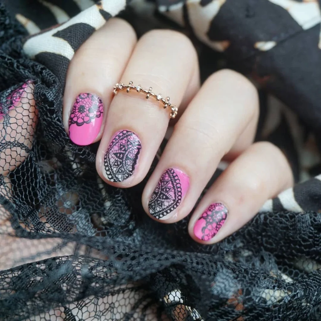 Joyful yet sophisticated, these bright pink nails are decorated with half-moon black lace patterns at the cuticle and tip areas. The lace includes detailed floral and geometric shapes, giving the design an ornamental, jewelry-like appearance. The contrasting colors make the lace stand out.