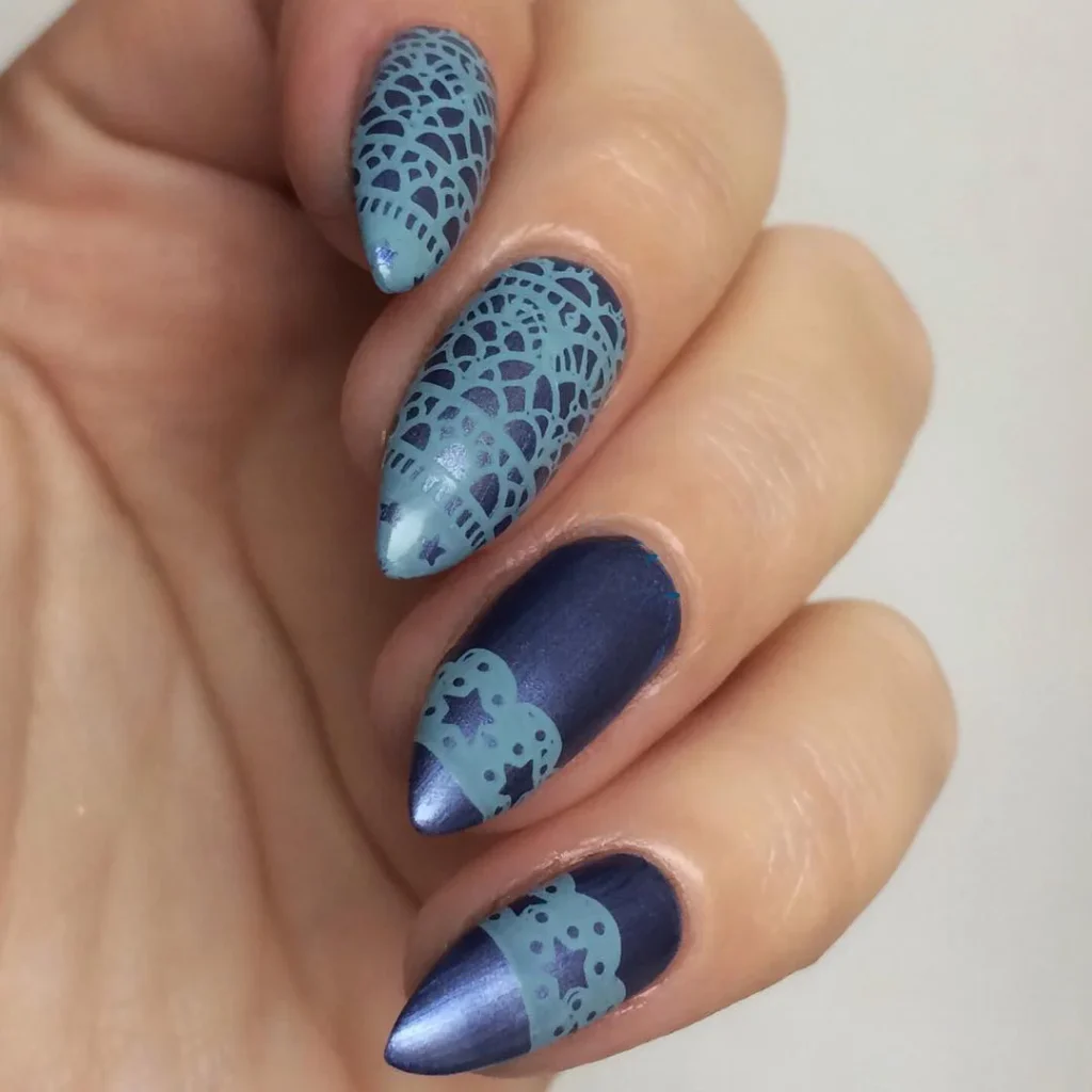 Sleek and modern, these navy blue nails are enhanced with matte light blue lace patterns. The designs range from intricate full-coverage lace to scalloped French tips with cutout star details. The contrast between the deep, satin-shine navy and the soft matte blue lace creates a sophisticated.