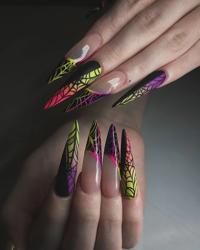 Eye-catching and edgy, these stiletto nails feature a vivid neon gradient of yellow, orange, and pink, overlaid with black spiderweb lace patterns. The gradient transitions smoothly across the nails, while the lace design adds an element of sharp contrast. The high-gloss finish amplifies the colors, making the design perfect for festivals.