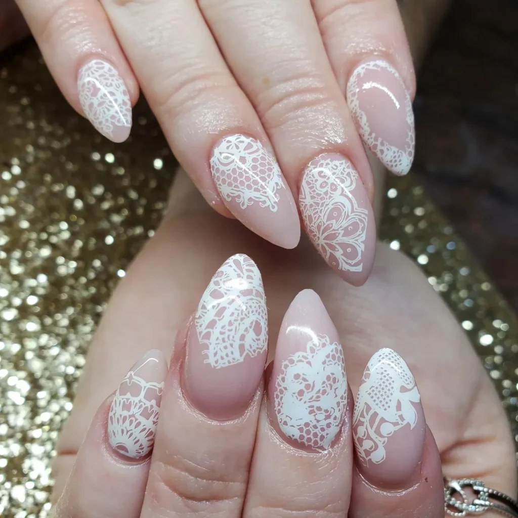Romantic and refined, these almond-shaped nails feature a translucent pink base overlaid with crisp white lace patterns. Each nail showcases a different lace motif, from delicate floral outlines to intricate netting, adding layers of visual intrigue. The white detailing pops beautifully against the soft pink, evoking a timeless bridal or vintage-inspired style.