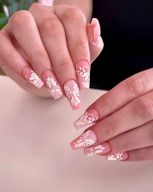 #20. Pink Coffin Nails with White Baroque Lace Design