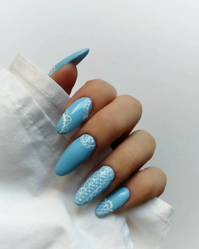 These sky blue nails feature delicate white lace designs placed strategically across each nail. The lace includes geometric web-like patterns, scalloped edges, and fine dotted accents that create a soft yet structured look. The pastel blue base adds a fresh, airy feel, perfect for spring or summer styling.