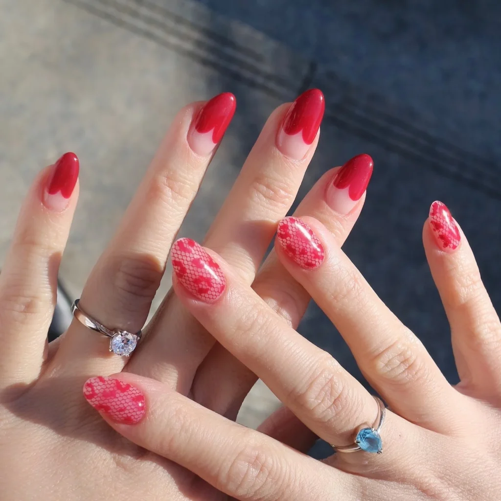 Bold yet romantic, these almond-shaped nails combine a deep red French tip design with accent nails covered in intricate red lace patterns. The lace overlay has a floral mesh appearance, creating a delicate contrast against the intense red polish. The glossy finish enhances the vibrancy, making this look ideal for date nights .