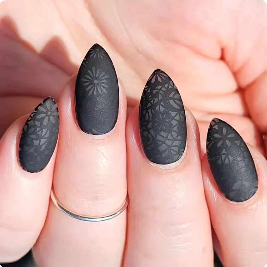 Understated and refined, these matte black nails hide a secret — a subtle glossy lace pattern that emerges under the light. The lace includes floral motifs and geometric webbing, adding dimension to the dark monochrome look. The almond shape complements the design’s elegance, while the matte finish offers a modern, velvet-like texture.