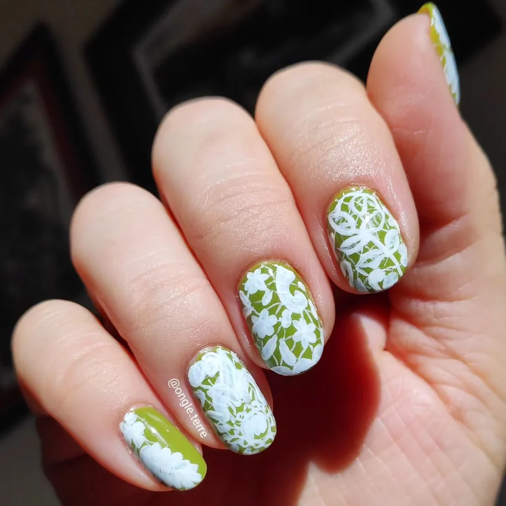 Fresh and lively, these olive green nails are topped with white floral lace designs. The lace features vines, blossoms, and swirling leaves, creating a full-coverage, garden-inspired look. The medium-round nail shape keeps the style soft and wearable for everyday use.