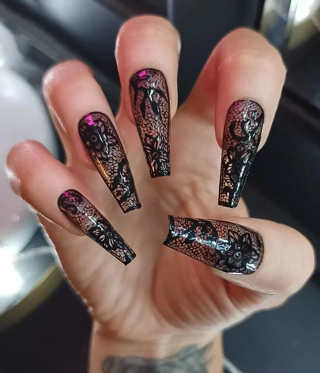#6. Long Black Lace Coffin Nails with Gloss Finish