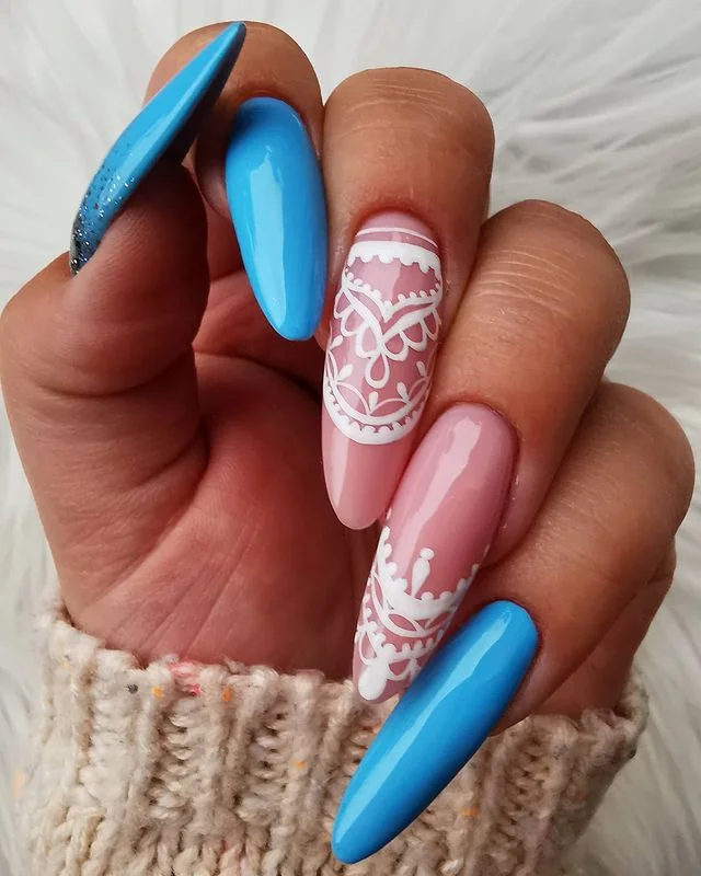 Vibrant and playful, this set mixes bold sky-blue nails with soft pink nails adorned in delicate white lace. The lace designs vary in detail, with some resembling fine embroidery and others forming crown-like shapes. The combination of solid blue and intricate pink lace nails creates a balanced contrast, making the look both fun and feminine.