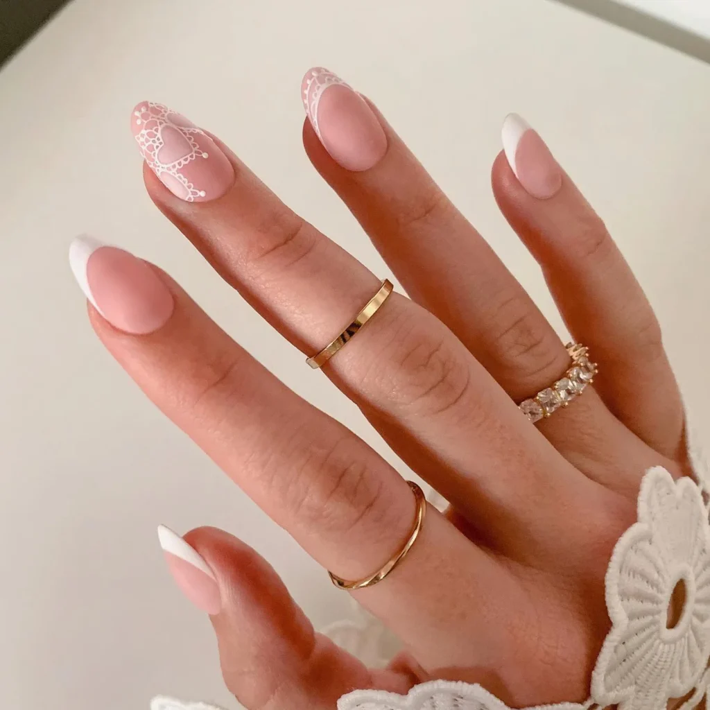Minimalist with a romantic touch, these matte pink nails feature French tips enhanced with intricate white lace designs. The lace patterns follow the curve of the tip, softening the contrast between the base and the white edge. Matte texture lends a modern, velvety finish that balances the delicacy of the lace.