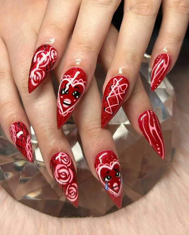 Playful yet passionate, these stiletto nails combine a sparkling red base with bright pink lace-inspired heart motifs. The design features a mix of roses, expressive cartoon-style heart faces, and swirled lace patterns for a whimsical yet romantic look. Each nail is unique, making the set feel artistic and custom-crafted.