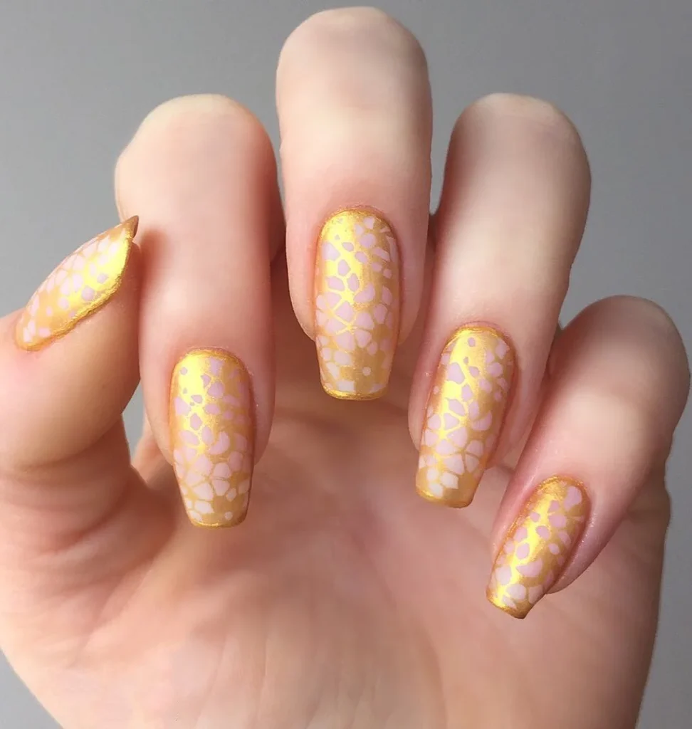 Warm and luminous, these nails start with a golden gradient base that softly transitions into a blush pink. Over this backdrop, a pink lace pattern is layered, creating a delicate yet opulent appearance. The lace incorporates small floral and geometric details, adding texture and intricacy to the metallic sheen. This combination feels both regal and romantic.
