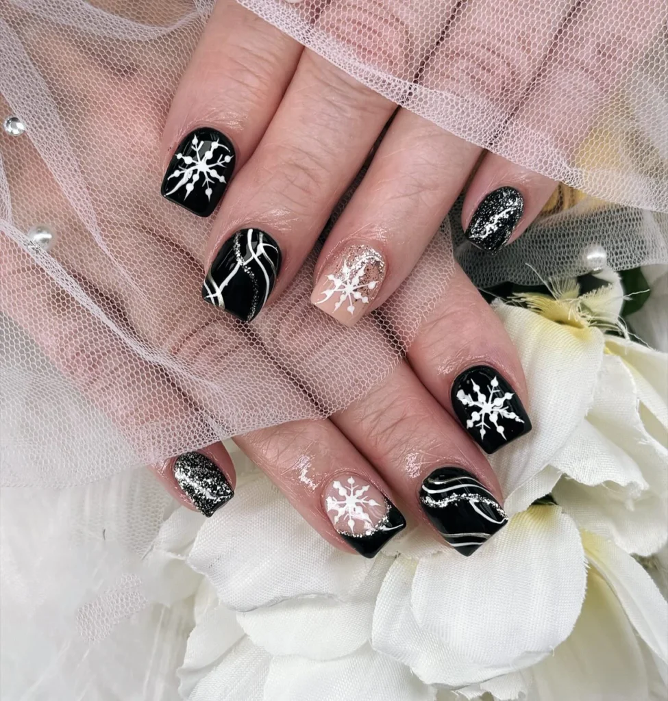Striking black nails with bold white snowflakes make a dramatic statement, softened by silver glitter accents and nude bases. This design captures the frosty beauty of winter nights while remaining modern and chic. Each snowflake is carefully detailed, adding elegance to the bold contrast.