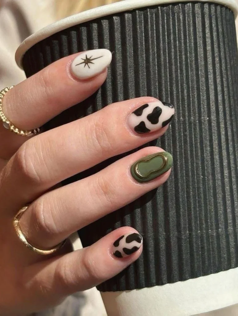 A playful twist on winter nails with bold cow print patterns paired with matte olive green. One nail stands out with a glossy agate-inspired green design, adding depth and creativity. The mix of neutral black-and-white with earthy tones feels trendy and fresh.