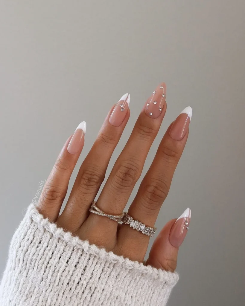 Sleek almond-shaped nails get an upgrade with clean French tips and delicate rhinestones scattered like frosty gems. This design balances minimalism with sparkle, making it versatile for holiday gatherings or a refined everyday look. The placement of crystals creates movement and catches the light beautifully, adding just the right touch of glamour.