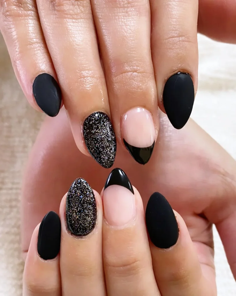 Sleek matte black nails are paired with glittery accents and glossy French tips for contrast. The mixture of textures creates a bold and stylish winter look. Glitter nails add sparkle, while glossy tips break the matte with sophistication.