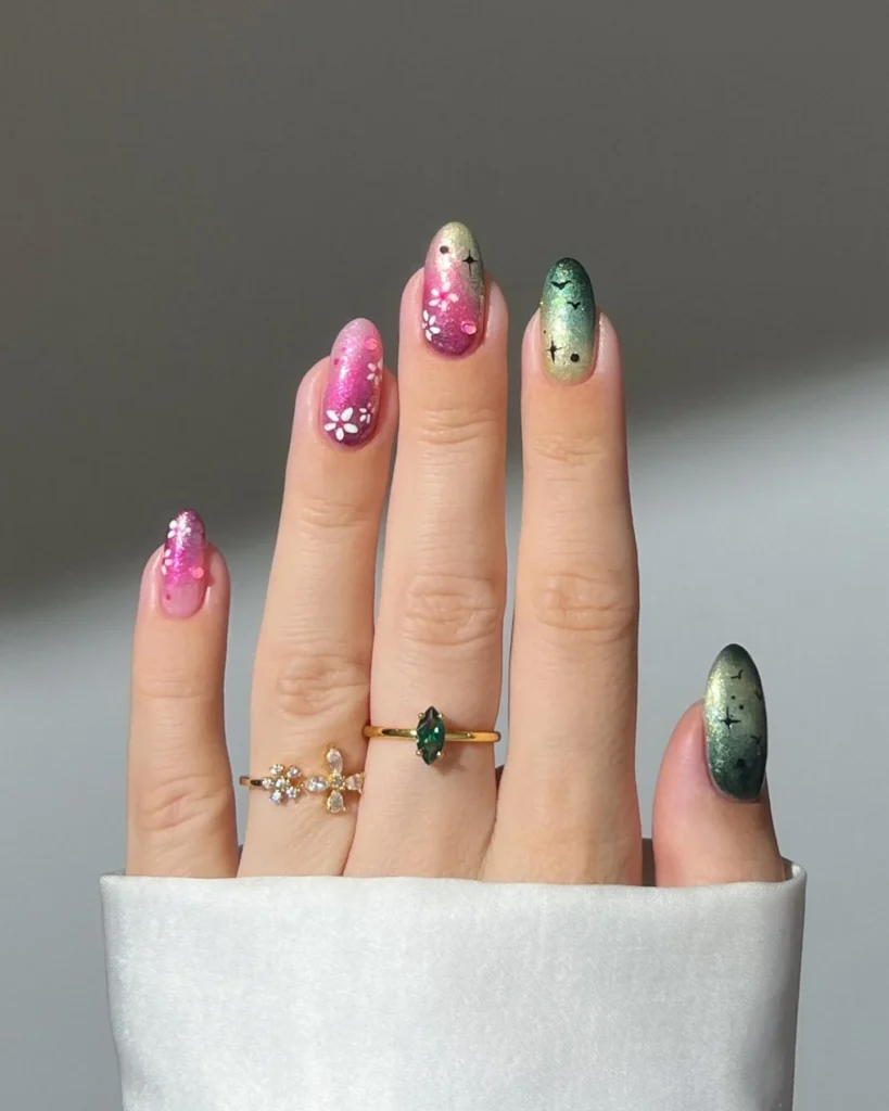 Vibrant pink and green ombre nails meet soft floral patterns, offering a refreshing take on seasonal color. The design blends festive sparkle with playful spring hints, perfect for anyone who loves color in winter. Glittery accents add a lively touch, making each nail look like a miniature canvas.