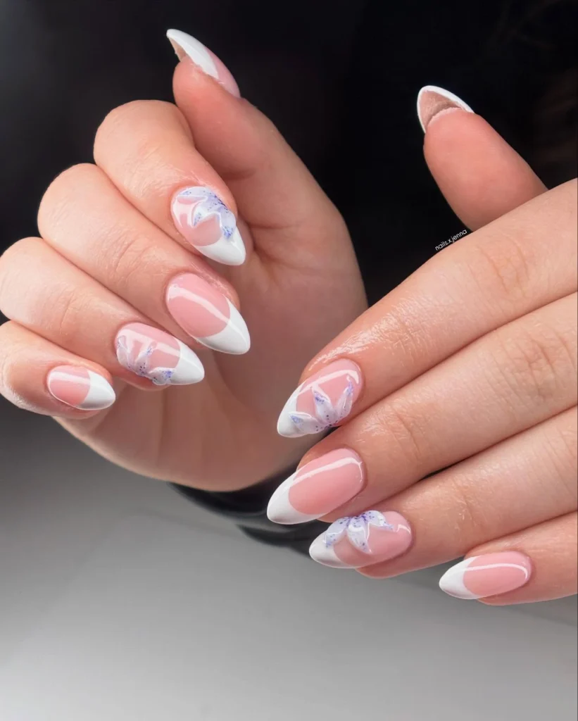 Classic French tips meet soft lavender floral designs, giving these nails a delicate, feminine appeal. The white tips frame the nails beautifully, while the floral accents add artistic charm and balance. Each flower feels hand-painted, offering uniqueness and depth to the design.