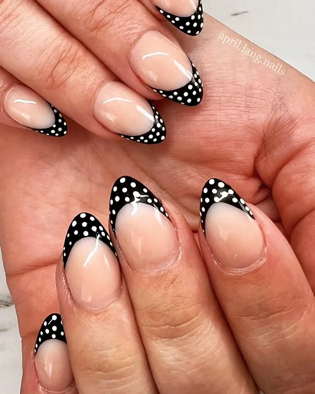 Classic French tips get a fun twist with polka dots along the edges. This design is chic, classy, and just the right amount of playful.