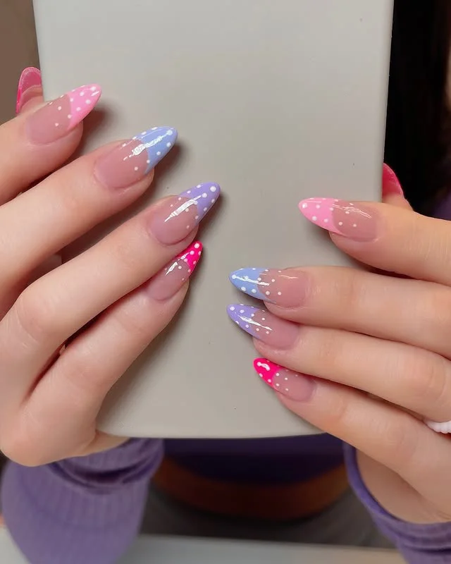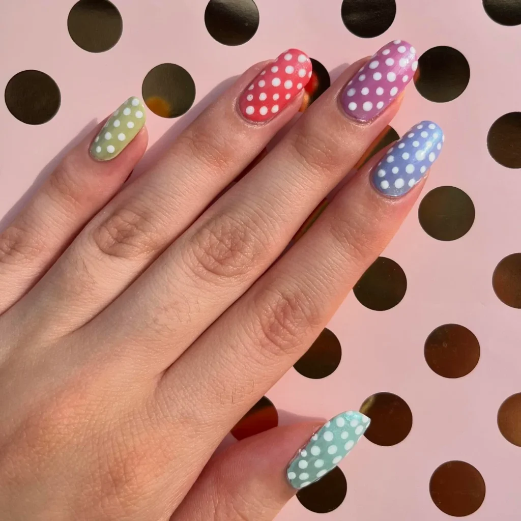 Who said polka dots can’t be fun? This playful look features candy-colored bases topped with classic white dots—cheerful, bold, and mood-boosting.