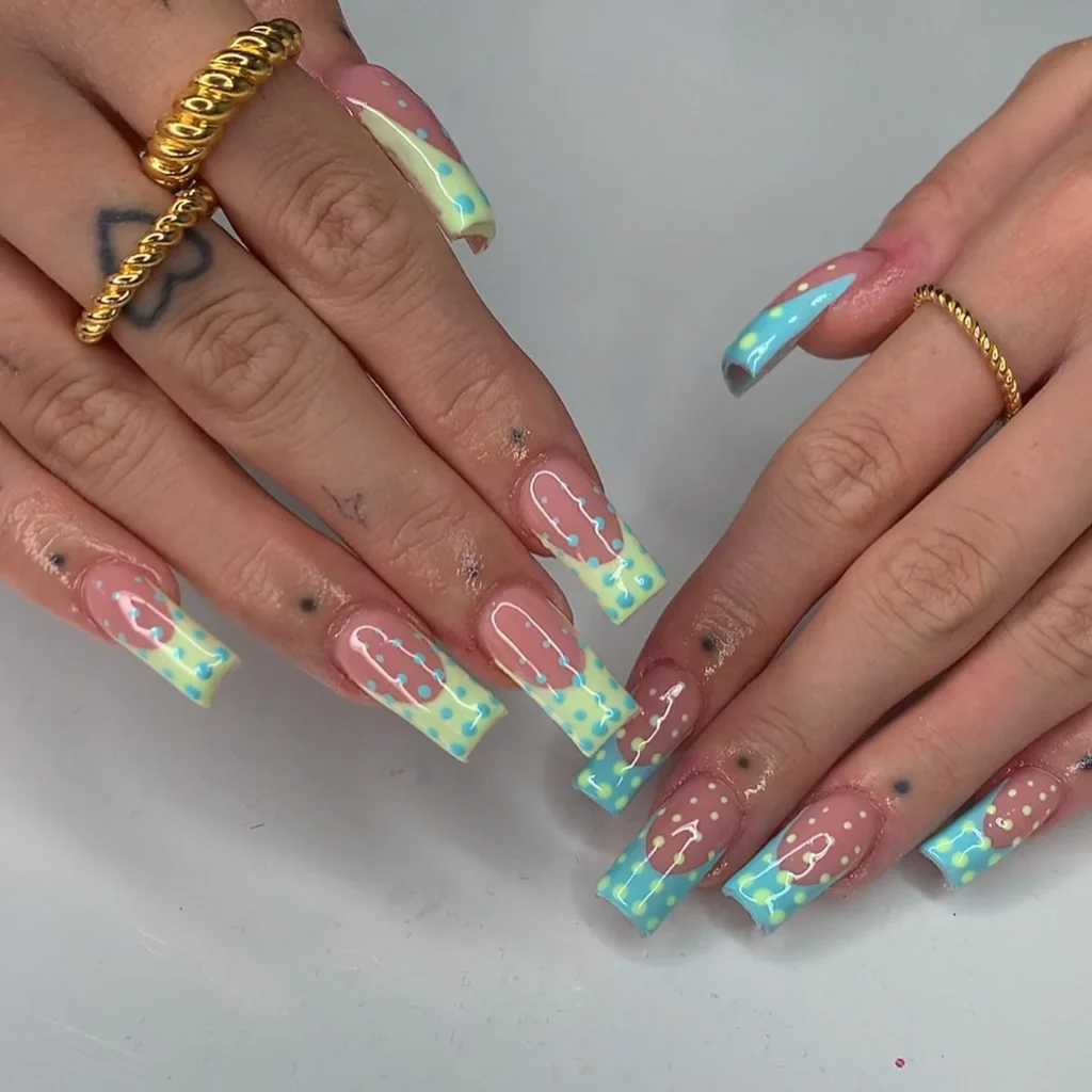 If fun had a nail look, this would be it. Neon yellow and aqua tips layered with dots bring energy that screams retro arcade meets beach vibes.