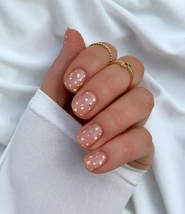 Delicate nude nails dotted with soft golden accents—minimalist but with a little luxury. They’re subtle enough for the office yet chic enough for a dinner date.