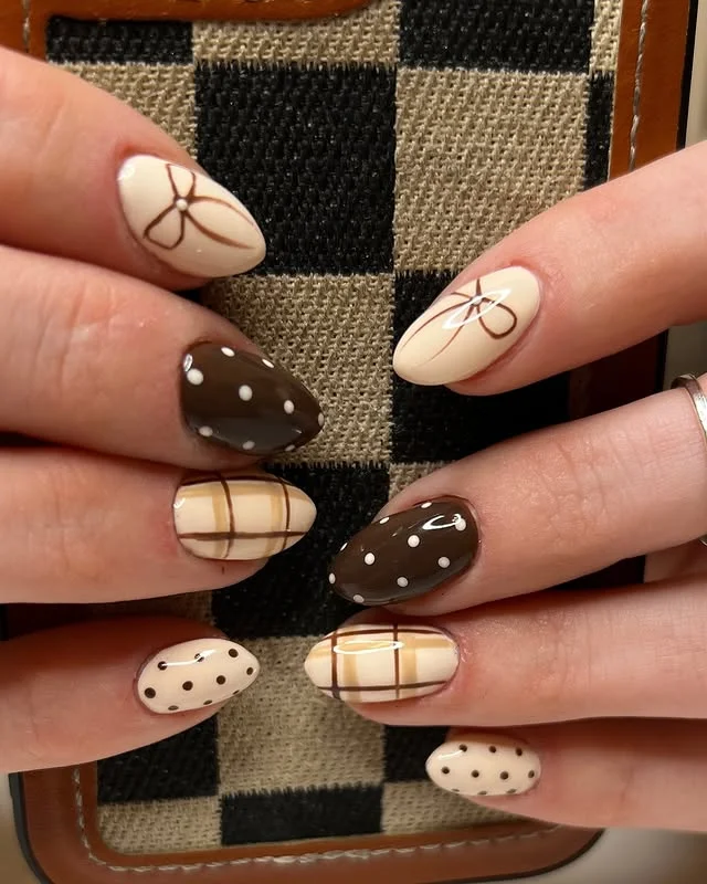 Warm browns, creamy beige, plaid accents, and soft polka dots—this set feels like cozy café vibes in nail form. Imagine sipping a latte with these beauties wrapped around your cup.