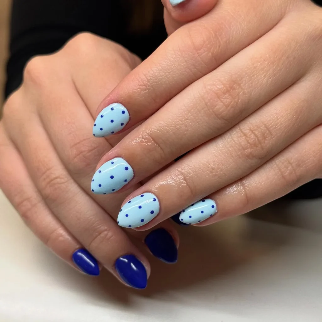 Cool and refreshing, baby blue nails sprinkled with darker blue dots make a playful yet polished statement. Think ocean waves dotted with bubbles.