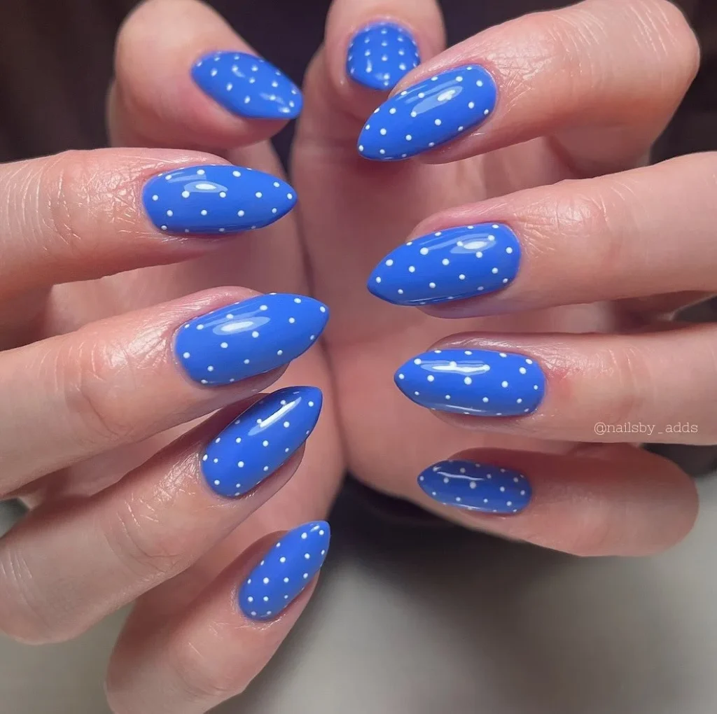 These royal blue nails with sharp white dots are unapologetically bold. They’re bright, confident, and demand attention—like a tailored blazer in nail form.