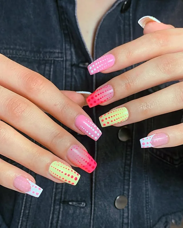 Hot pink, lemon yellow, neon green—layered with playful dots, this look is pure fun. It’s basically a rave on your nails.