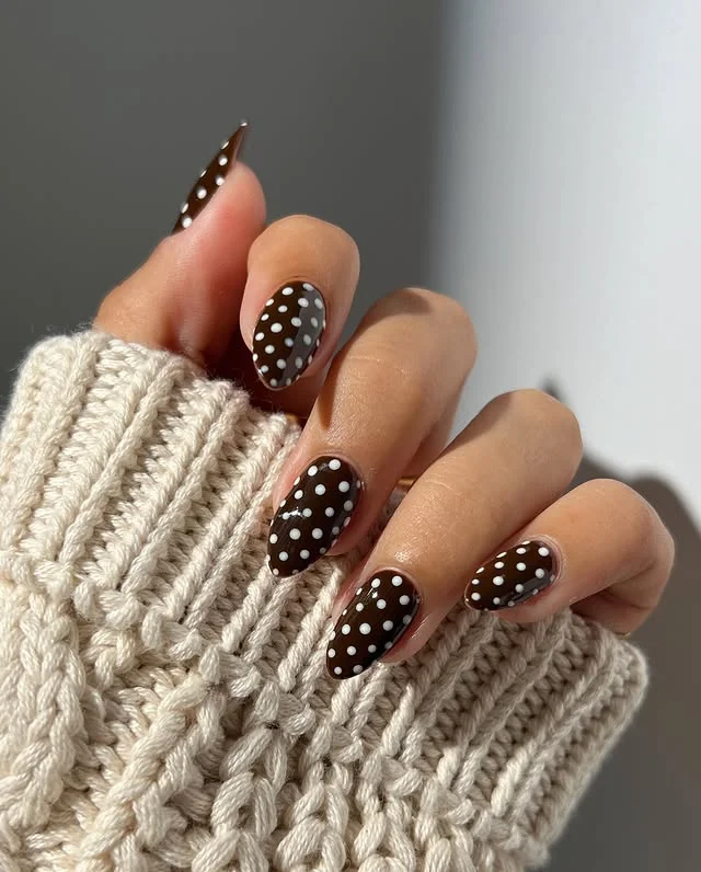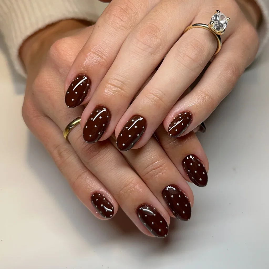 Rich, velvety brown nails dotted with white make this design deliciously cozy—like hot cocoa in nail form. It’s warm, autumn-ready, and stylish without being over the top.