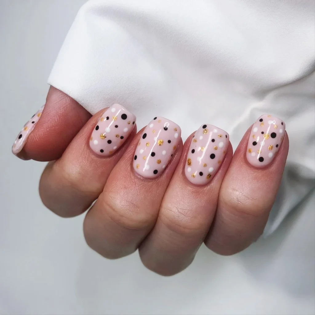 This playful design mixes black, white, and gold dots on a soft nude base, creating a scattered sparkle effect. Like confetti caught in champagne bubbles.