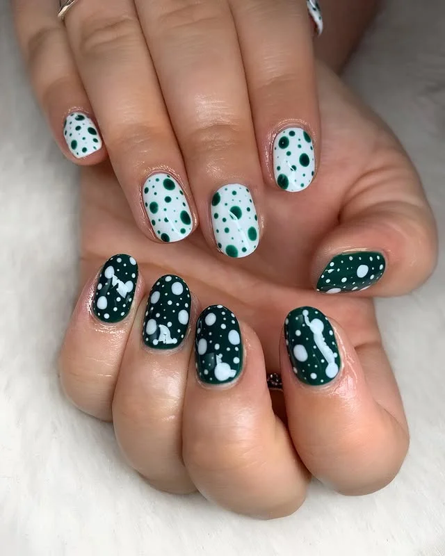 Moody and bold, these deep green and white nails with oversized polka dots feel like high-fashion street style. The mix of large and tiny dots keeps it fun without losing the edge.