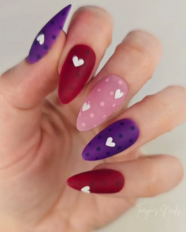 This one’s giving total Valentine’s Day energy. With matte purple, pink, and red bases, dotted with tiny polka dots and topped off with white hearts—it’s the ultimate “love is in the air” mani. Chic yet playful, like wearing a love letter on your fingertips.