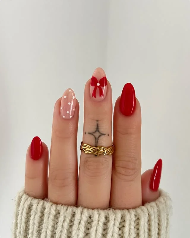 Picture yourself at a holiday party, holding a glass of bubbly—these nails are that vibe. The bold red nails paired with one nude-and-polka-dot accent and another bow detail create a festive, gift-wrapped look.