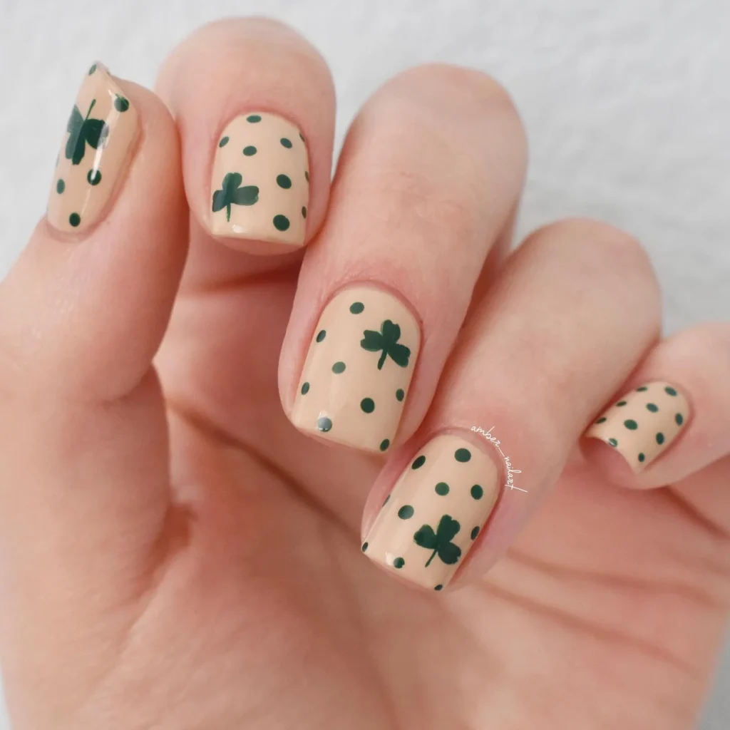 These nails are giving pure St. Patrick’s Day charm! Beige polish sprinkled with green dots and shamrock accents feels festive without going overboard. Cute, seasonal, and lucky enough to make you feel like you found a pot of gold.