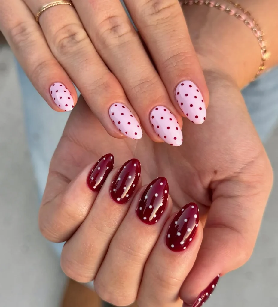 This design feels like date night glam. Alternating soft pink nails with burgundy polish, both detailed with crisp polka dots, creates a striking balance of bold and feminine. It’s elegant, playful, and effortlessly chic.