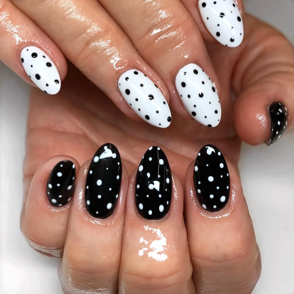 Drama meets elegance with alternating black and white bases topped with reversed polka dots. It’s striking, stylish, and just the right balance of playful and polished.