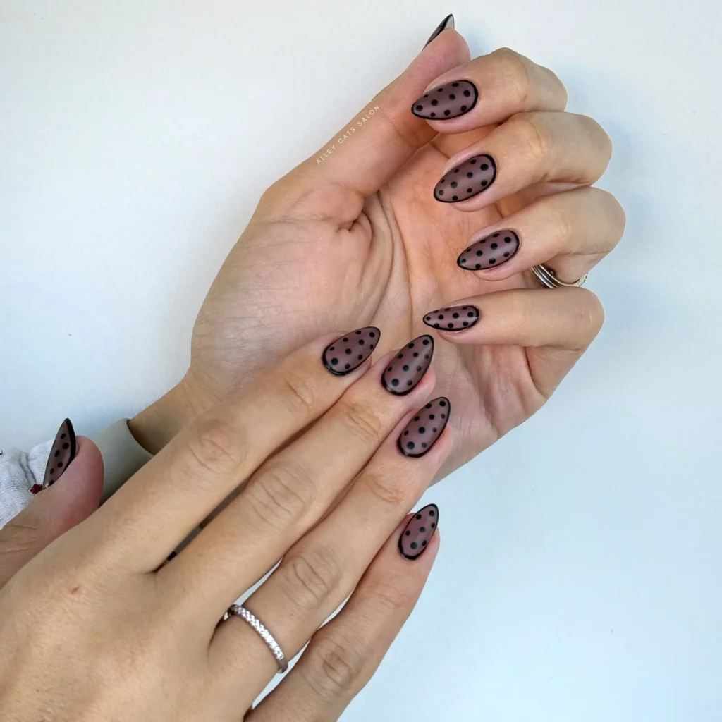 This design blends sultry vibes with chic finesse. The sheer smoky base paired with matte black dots feels sophisticated yet mysterious.