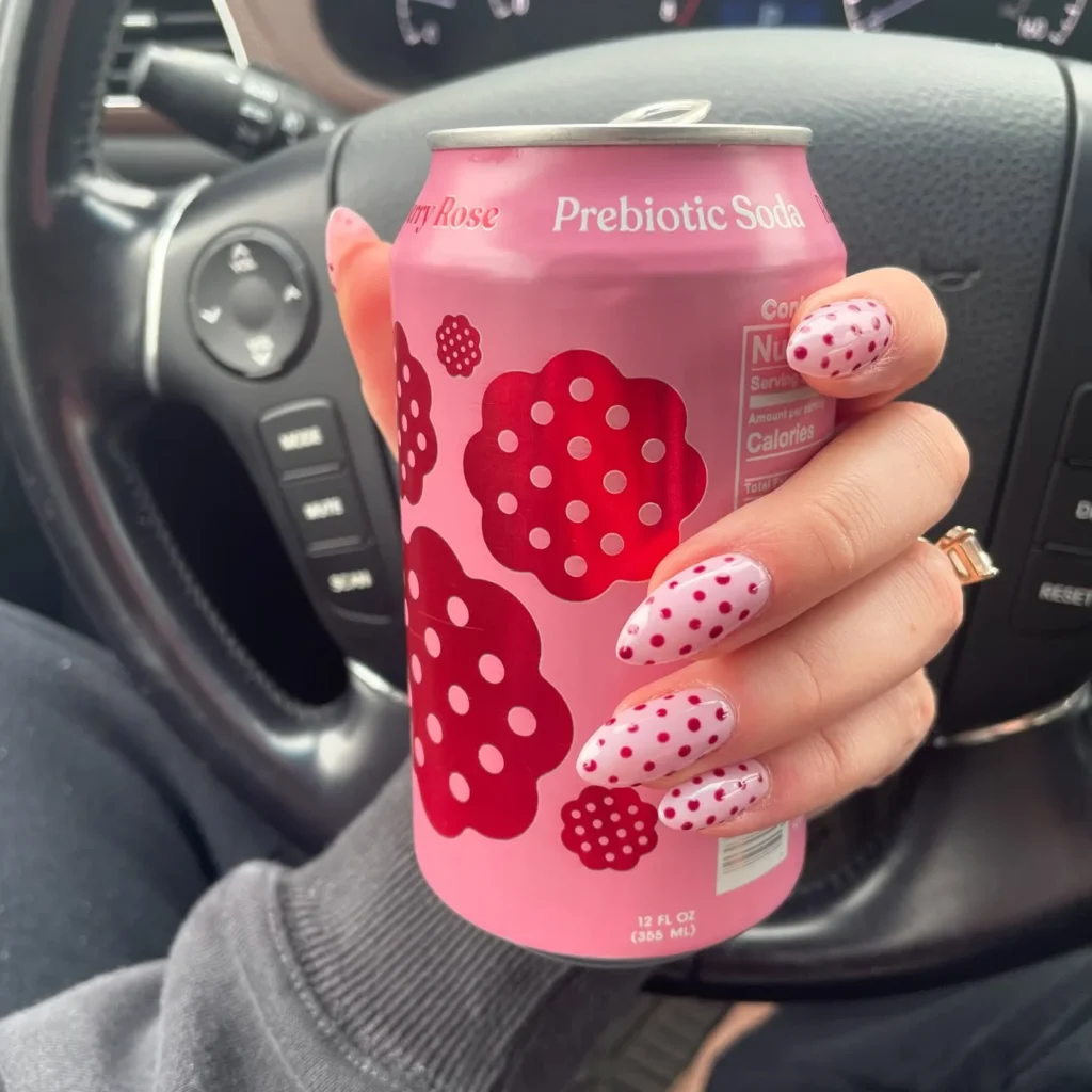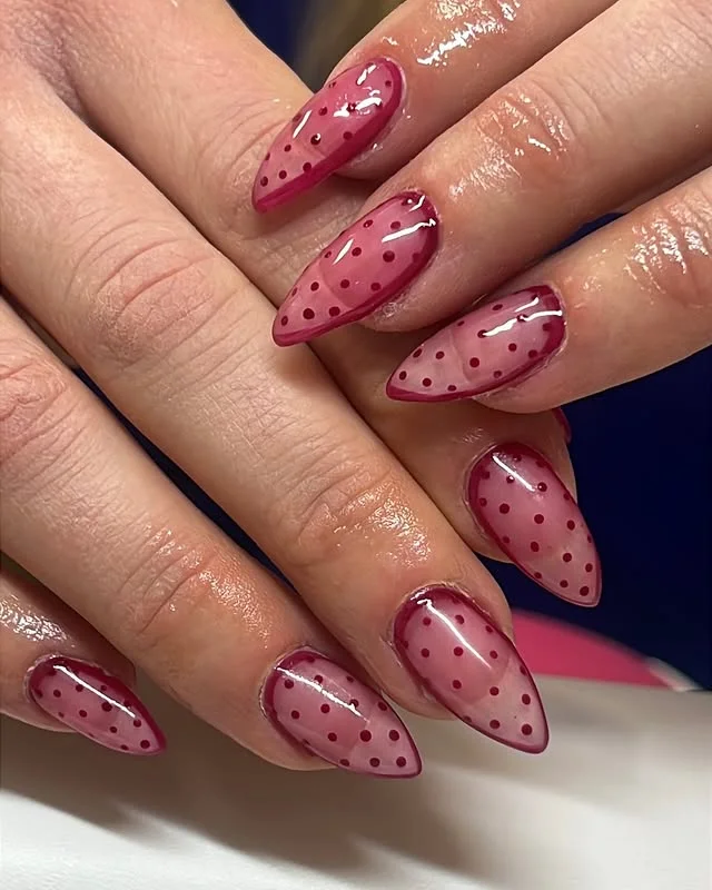 This look is pure fun—pink nails scattered with red polka dots that practically scream girls’ night out. It’s playful yet chic, and works beautifully with flirty outfits.