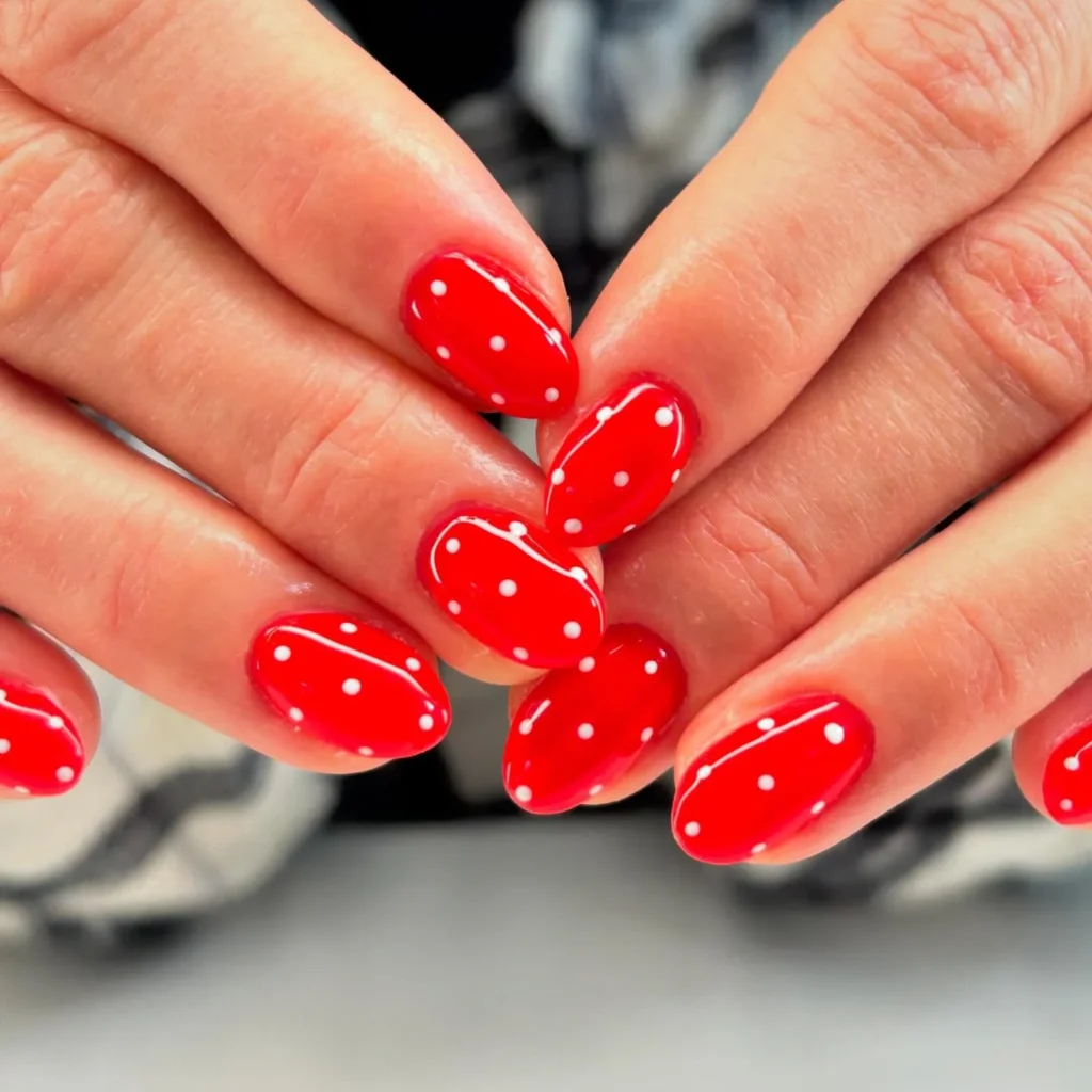 Bright red nails sprinkled with white dots give instant retro vibes. Fun, bold, and timeless—it’s a nod to vintage fashion with a modern twist.