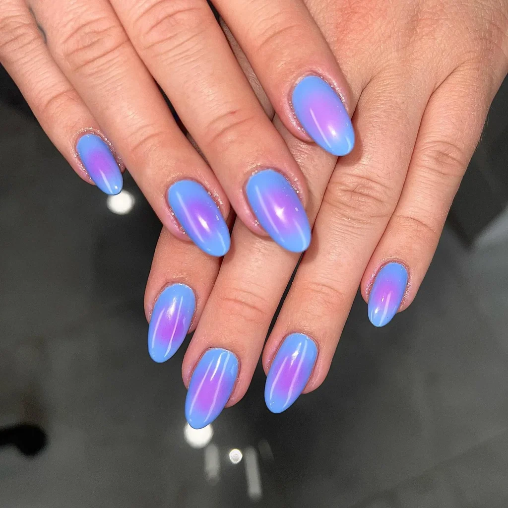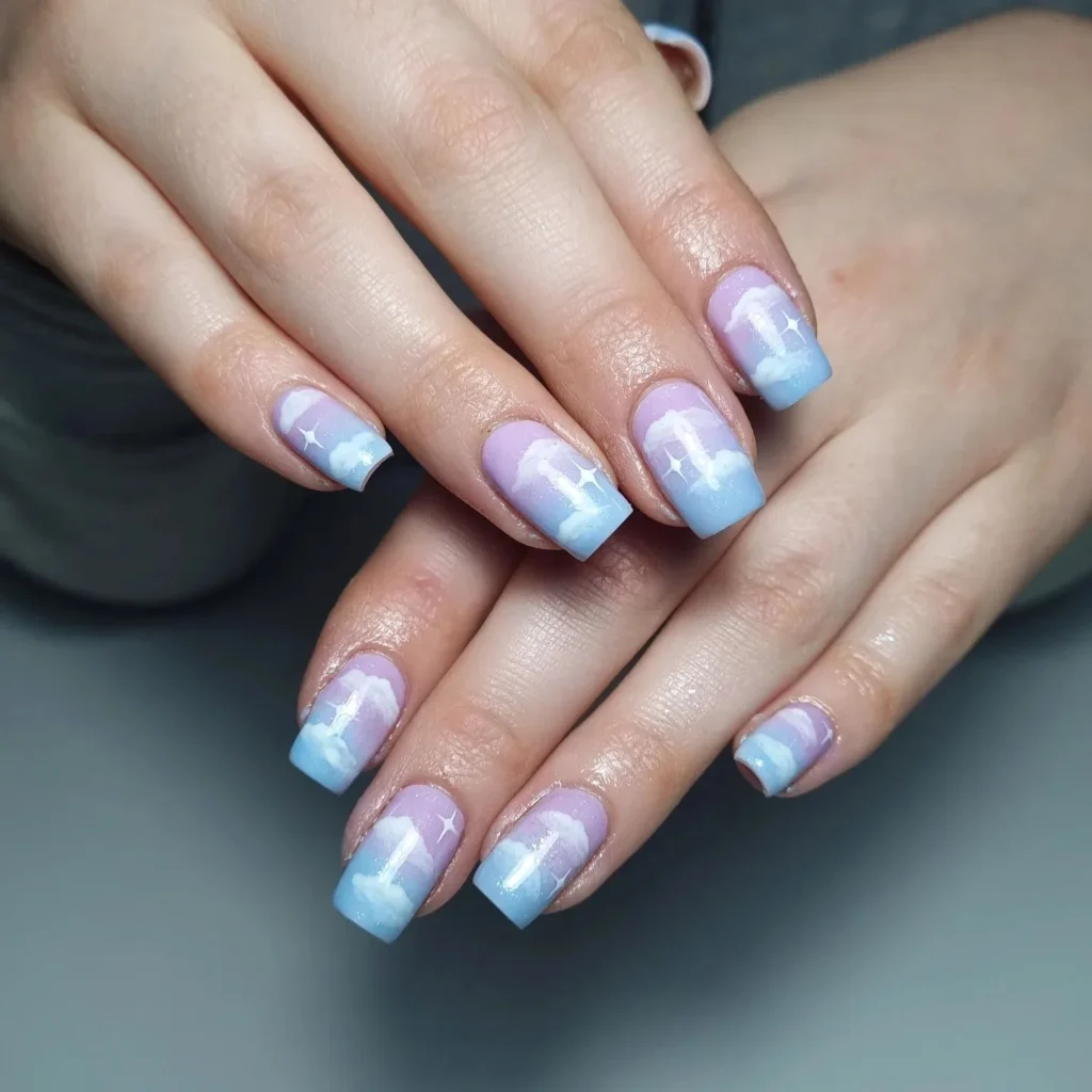 Soft lavender meets baby blue in a cloud-like blend that feels dreamy and calm. I love how the pastel shades fade into each other like a painted sky after sunset. It’s the kind of nail art that makes you pause and smile without realizing it. The shimmer catches light gently like a quiet afternoon glow.