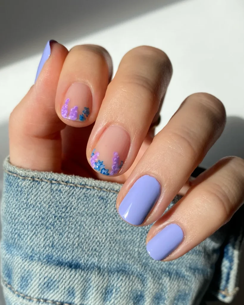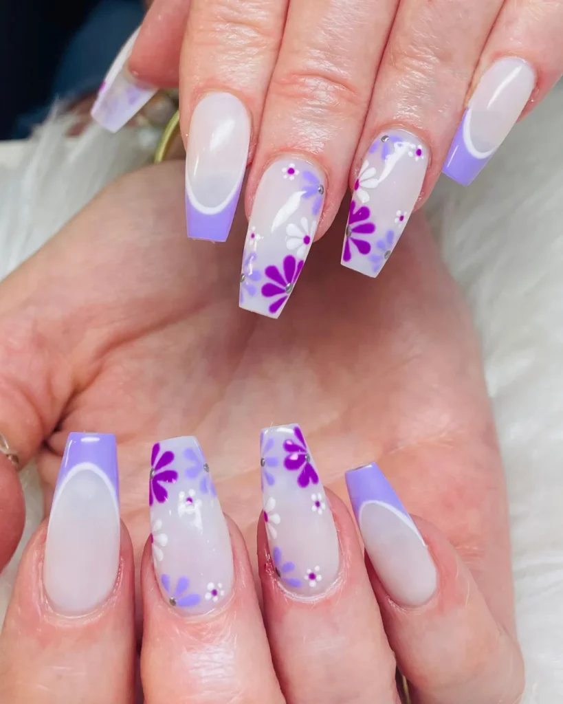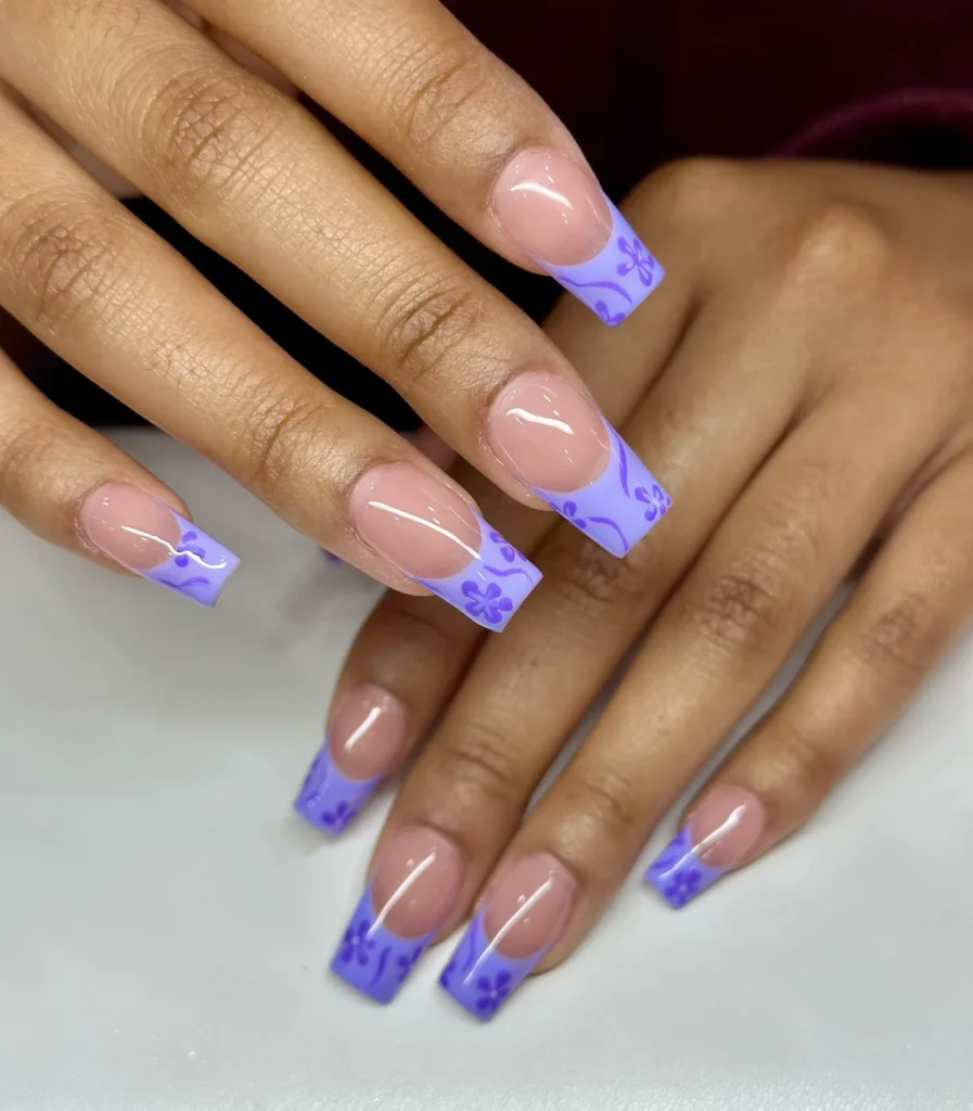This look takes the classic French manicure and gives it a dreamy violet twist. The floral patterns along the tips add such soft charm. I love how glossy and delicate it feels perfect for both everyday wear and special days.