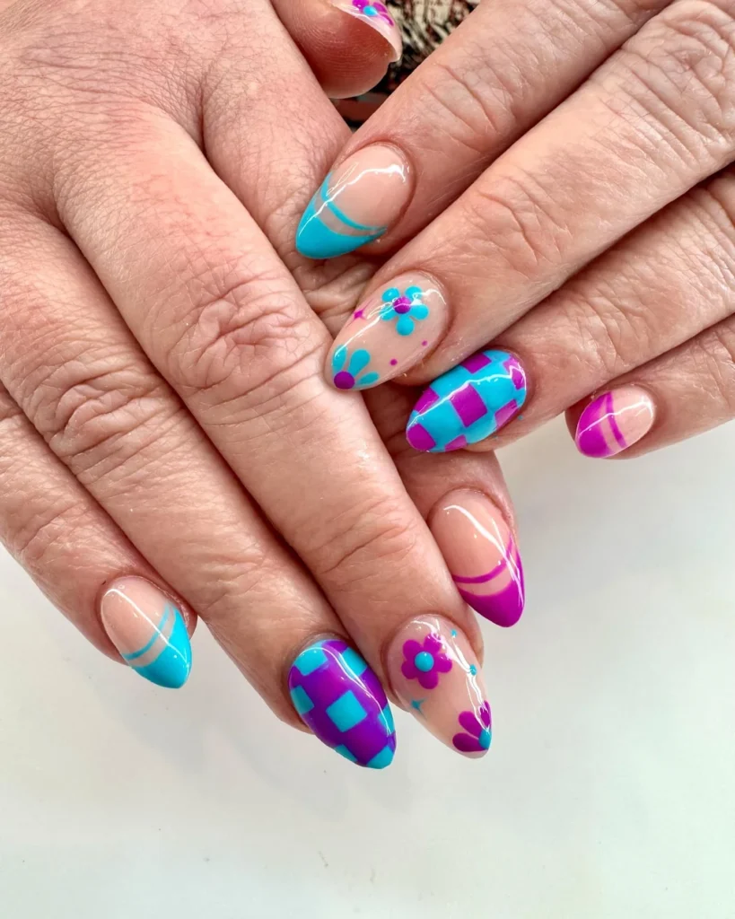 This design instantly takes me back to the playful side of fashion. The mix of turquoise and purple checks with cute floral accents feels fun fearless and a little nostalgic. I love how it balances bright color with nude space keeping it bold yet wearable.