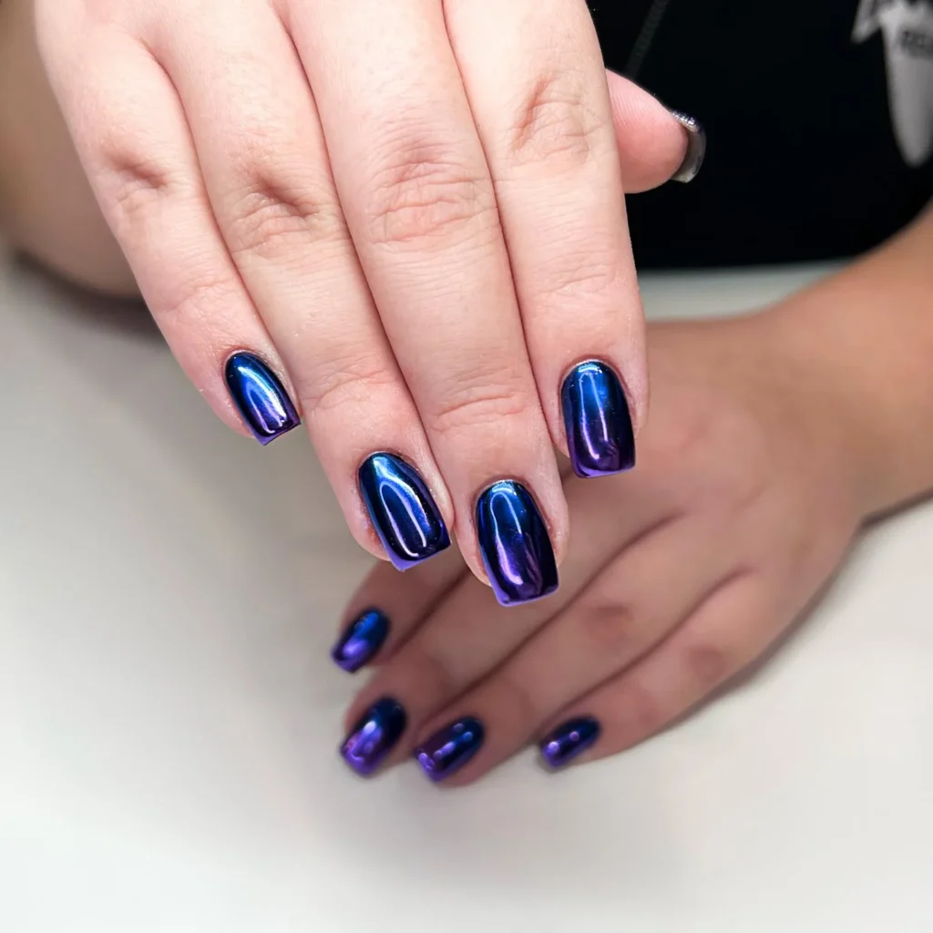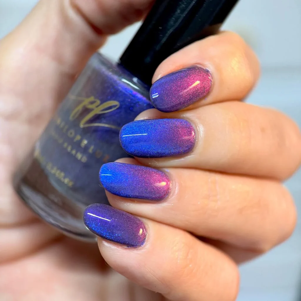 Blue and purple shimmer blend like twilight skies that shift with every move. The light hits and suddenly it glows pink then deep blue then something in between. I love how effortless and mesmerizing this nail color feels. It’s like carrying a little galaxy in your hands.