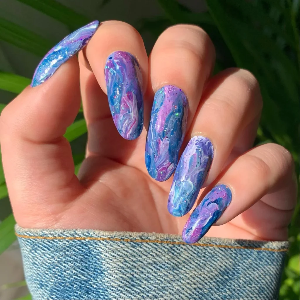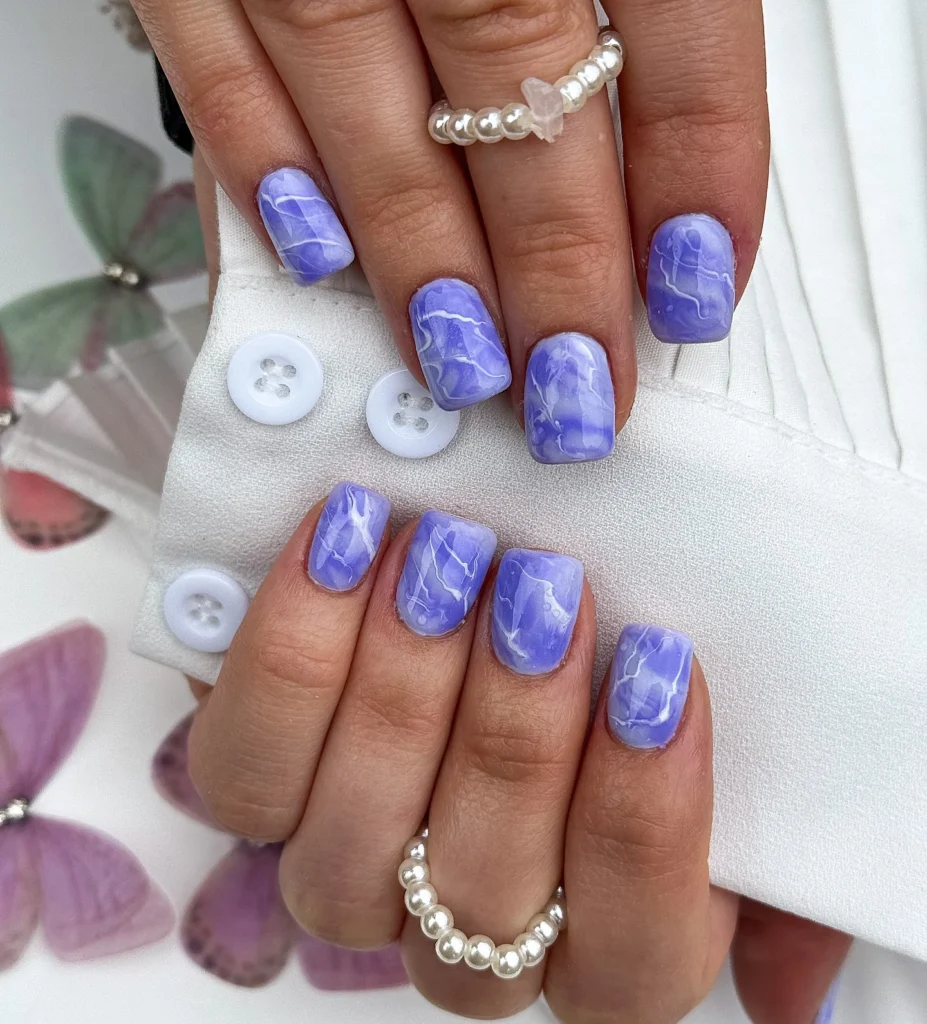 These nails look like a canvas dipped in blue and purple dreams. The marble effect feels artistic and carefree almost like paint swirling in water. I adore how each nail turns out slightly different yet perfectly connected.