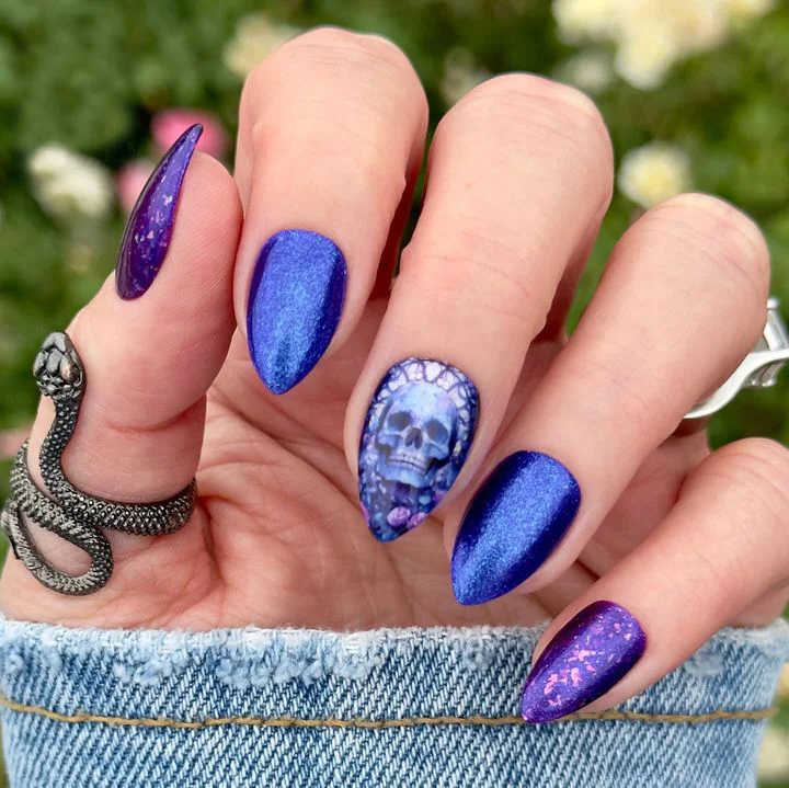 Moody metallic purple with a skull accent feels edgy but stunning. I love how it mixes mystery and glam in one look. The shimmer gives it that extra kick while still feeling wearable. Perfect for anyone who loves a little drama in their nail art.