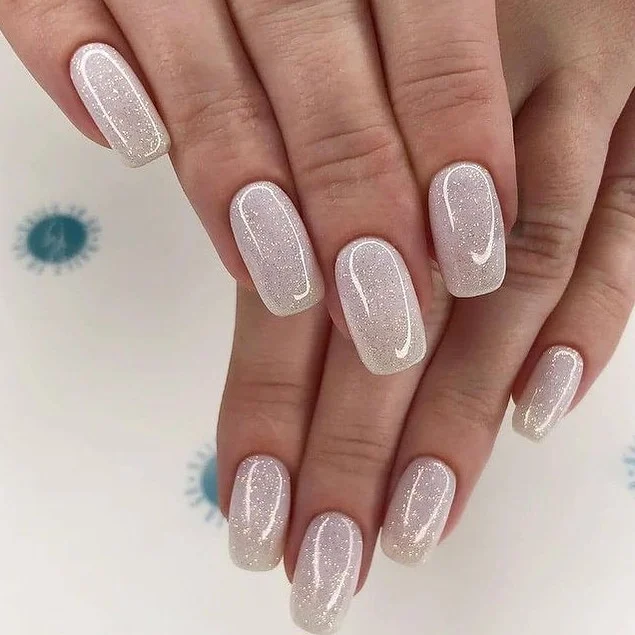 Square nails fade from nude to sparkling champagne glitter, creating a soft ombre effect. The glitter adds a festive sparkle, while the nude base keeps the design elegant and understated. This manicure is perfect for winter parties, weddings, or everyday wear.